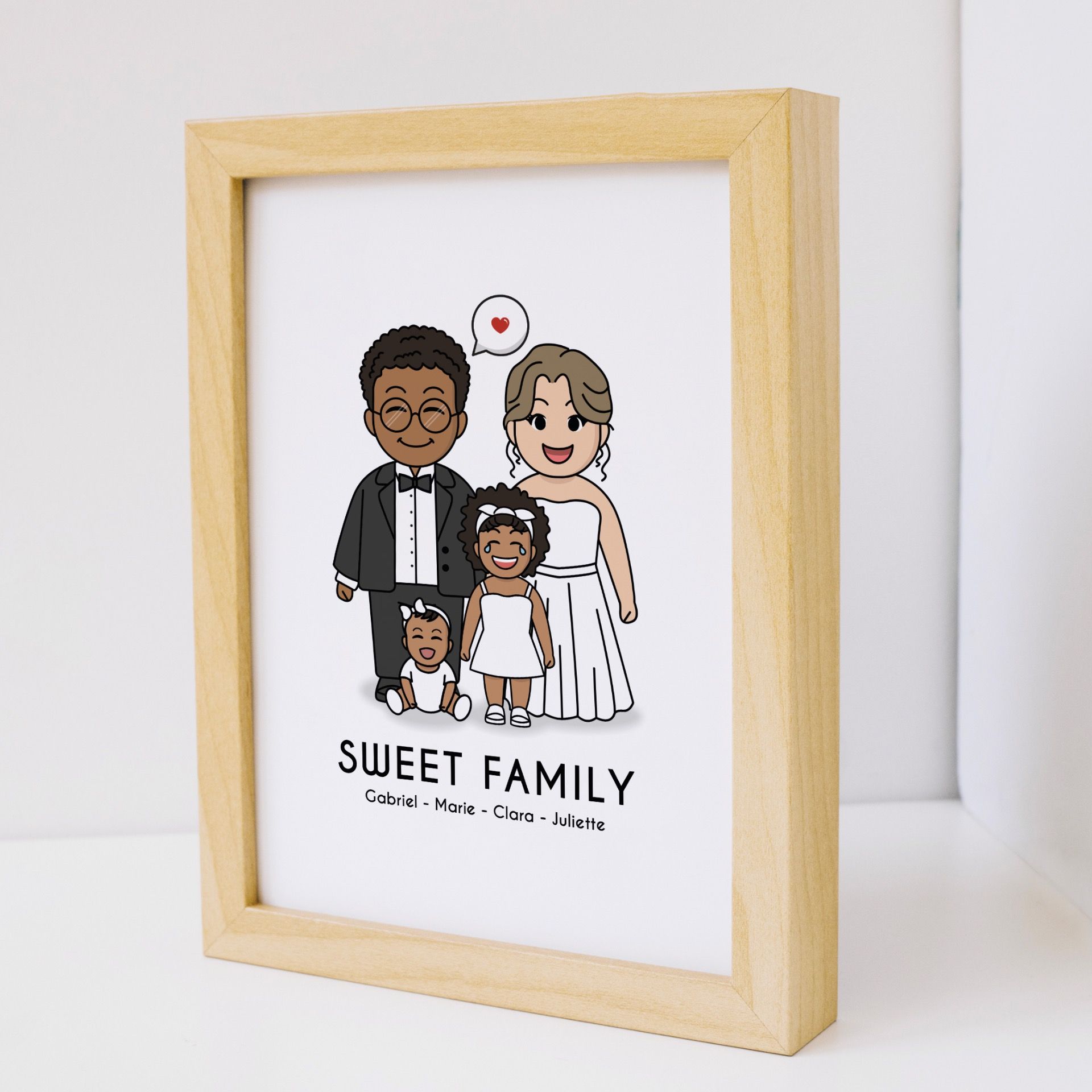 Cette affiche personnalisée met en scène votre tribu sous forme de petites figurines, dessinées avec soin et tendresse.